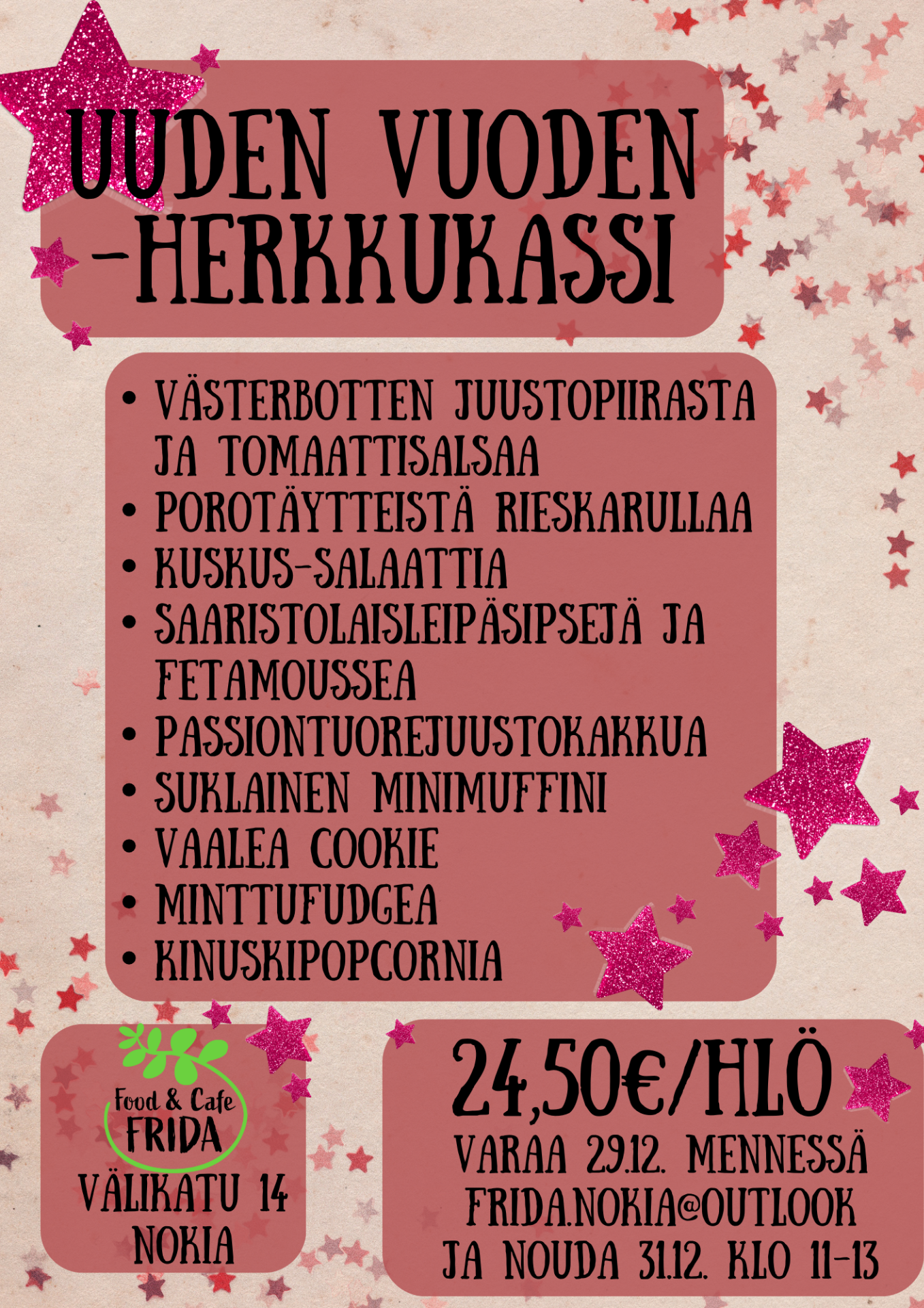 Yksityistilaisuuksien menut ovat muokattavissa ja Fridasta saatkin juuri sinun juhliisi sopivat tarjottavat. Kysy lisää yksityistilaisuuksista sähköpostitse frida.nokia@outlook.com tai puhelimitse 045 3400334.